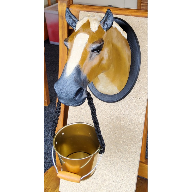 Measuring approximately 31cm in depth, 19cm in width, and 27cm in length, this piece showcases a finely detailed horse head carrying a pale in its mouth, attached with rope—ideal for a small plant or other decorative touches.
